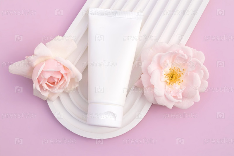 Белый пластиковый тюбик с кремом для лица, рук и тела и розовыми розами. Шаблон органической косметической концепции. Плоская планировка, пространство для копирования