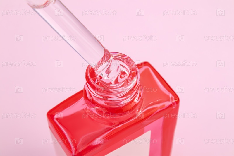 Капает натуральное эфирное масло розы в бутылку на розовом фоне. Лечение ухода за кожей. Лечение прыщей