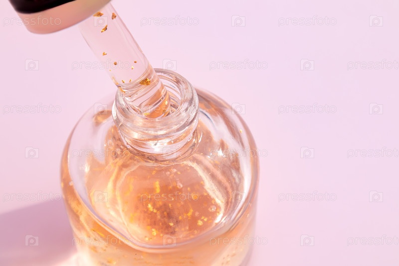Косметическая пипетка с золотой сывороткой 24 карата или эфирным маслом на светло-розовом фоне. Уход за кожей, омолаживающая процедура