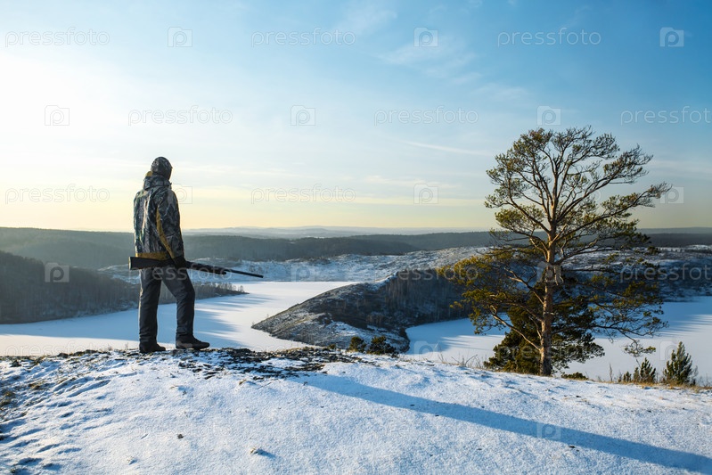 Охотник с ружьем, одетый в камуфляжную одежду, стоит на вершине холма в зимний сезон