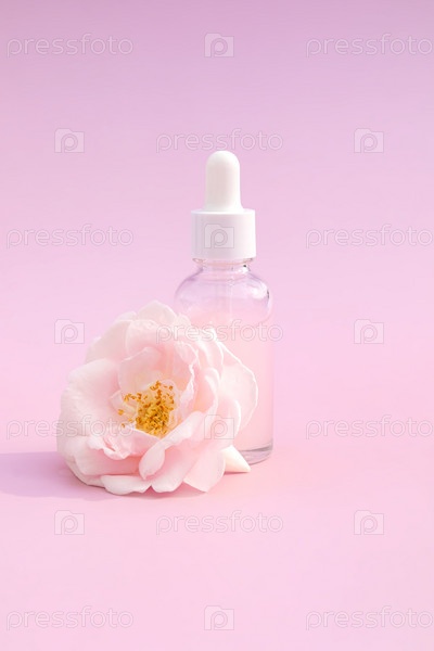 Композиция с бутылкой эфирного масла и красивыми цветами роз на розовом фоне