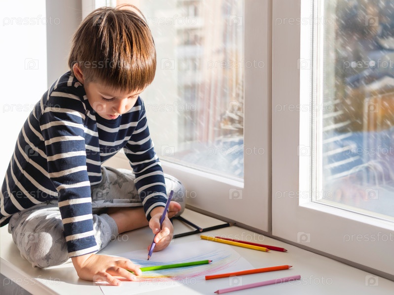 Мальчик-левша сидит на подоконнике и рисует радугу цветными карандашами. Творческий досуг детей дома