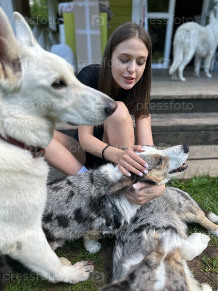 Молодая красивая женщина играет с собакой на улице