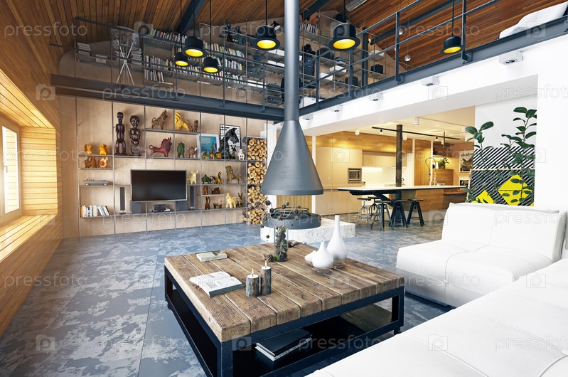 Современный интерьер гостиной в стиле лофт