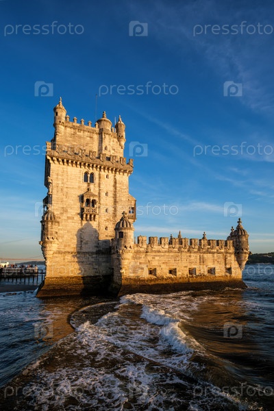 Башня Белен или Башня Святого Винсента - известная туристическая достопримечательность Лиссабона и туристическая достопримечательность - на берегу реки Тежу Тежу на закате. Лиссабон, Португалия