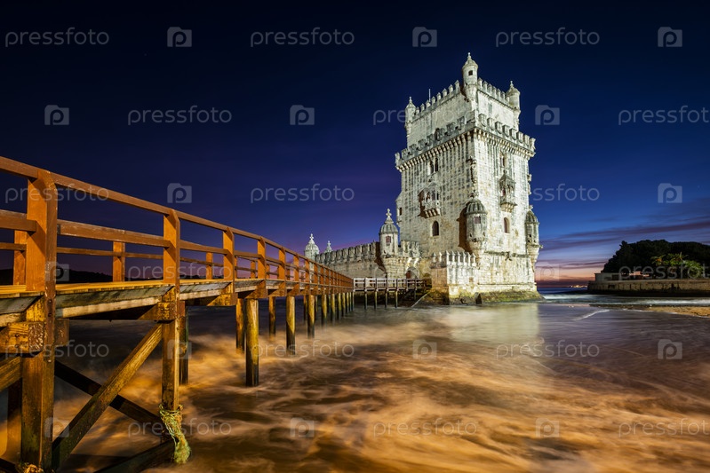 Башня Белен или Башня Святого Винсента - известная туристическая достопримечательность Лиссабона и туристическая достопримечательность - на берегу реки Тежу (Тежу) после захода солнца в сумерках с драматическим небом. Лиссабон, Португалия