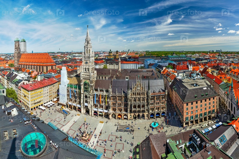 Вид с воздуха на Мюнхен «рыбим глазом» - Мариенплац, Нойес Ратхаус и Фрауэнкирхе из церкви Святого Петра. Мюнхен, Германия