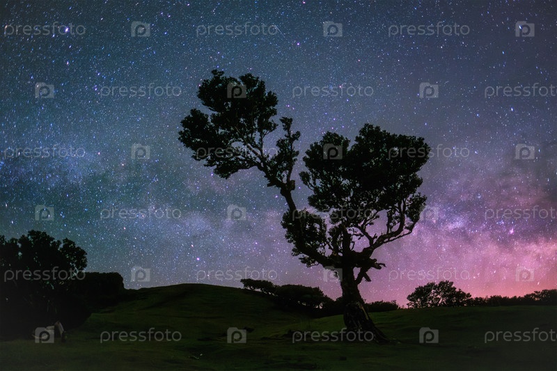 Вековые деревья в фантастическом волшебном идиллическом лесу Фанал Лаурисильва ночью со звездным небом и Млечным путем. Остров Мадейра, Португалия
