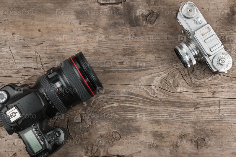 Противостояние цифровой и пленочной камеры, стоящей на деревянной поверхности