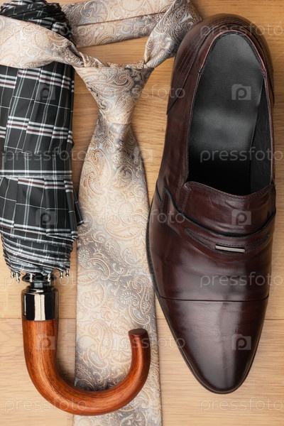 Классические мужские туфли, галстук, зонтик на деревянном полу