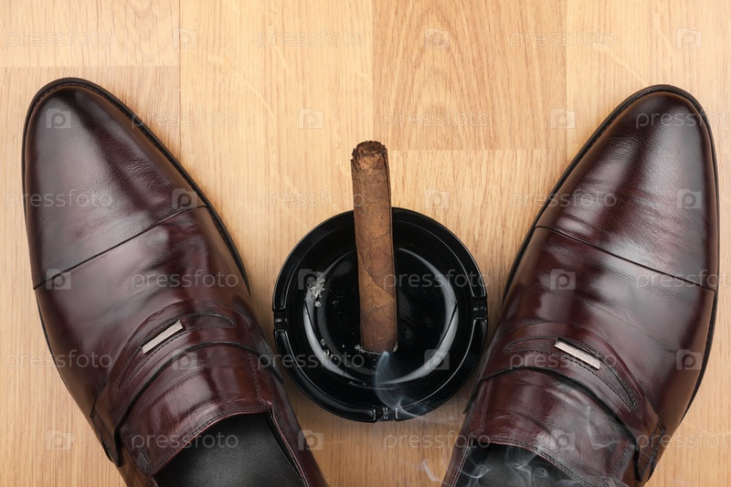 Классические мужские туфли, пепельница и дымящая сигара на деревянном полу