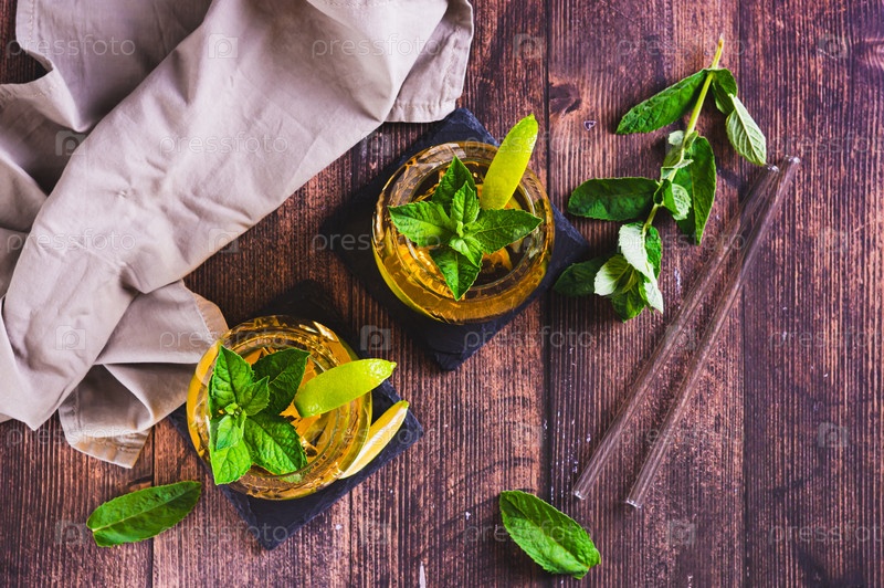 Освежающий чай со льдом с мятой и лаймом в стаканах на столе