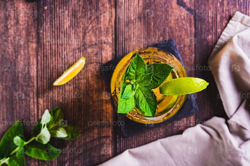 Крупный план освежающего чая со льдом с мятой и лаймом в стакане на столе