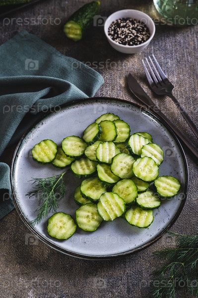 Тарелка с сочными зелеными ломтиками огурца и укропа на столе, вертикальный вид