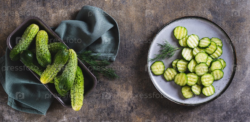 Тарелка с сочными зелеными огурцами и укропом на столе, вид веб-баннера