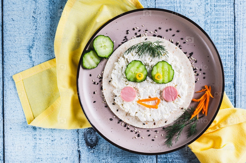 Крупным планом лицо из тортильи, рикотты, колбас, овощей для детского завтрака, вид сверху