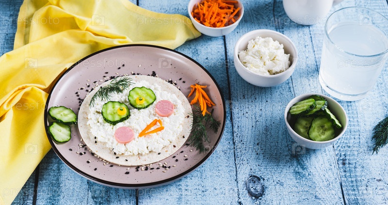 Лицо из лепешки, творога, колбасы, овощей для детского завтрака. Веб-баннер