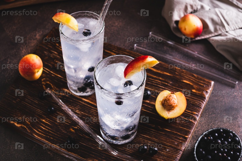 Ледяной коктейль с черной смородиной и нектарином в стаканах на столе