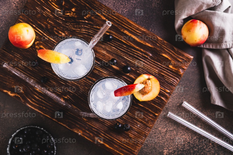 Освежающий лимонад с черной смородиной, нектарином и льдом в стаканах на столе