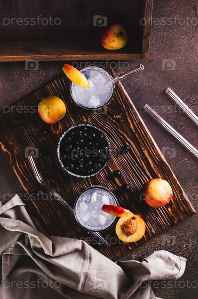 Ледяной коктейль с черной смородиной и нектарином в стаканах на столе и вертикальном виде