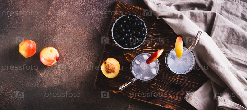 Ледяной коктейль с черной смородиной и нектарином в стаканах на столе, вид веб-баннера