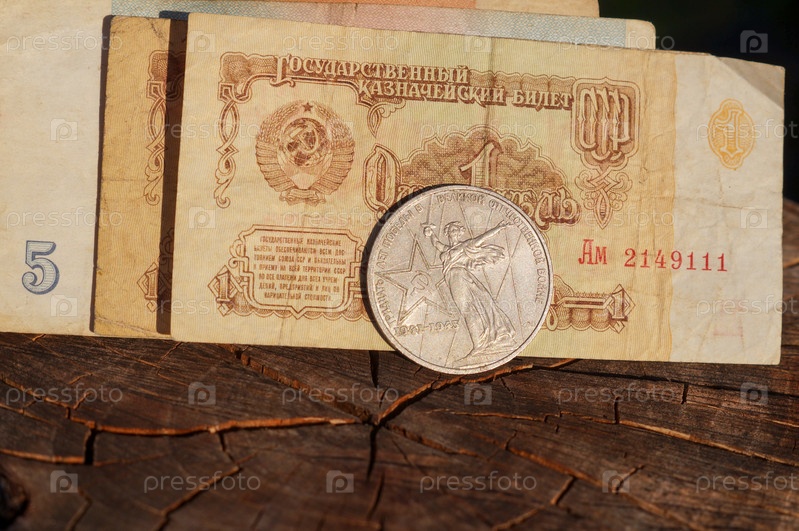 Старые бумажные деньги СССР и монета Родина Мать зовет