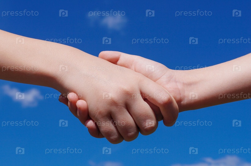 Рукопожатие на фоне голубого неба с белыми облаками