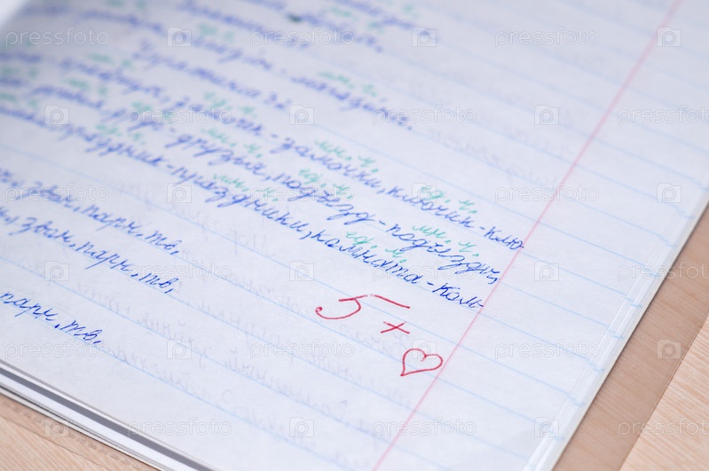 Оценка пять с плюсом и сердечком от учителя в тетради по русскому языку
