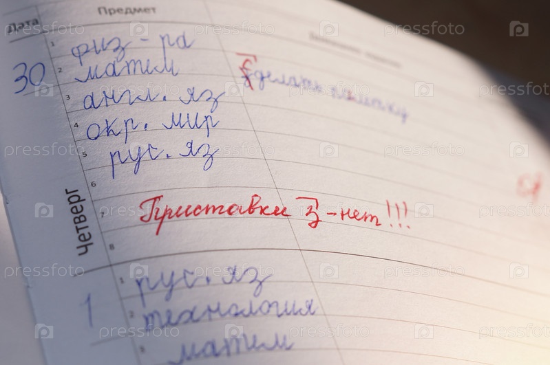 Запись красной ручкой учителя в школьном дневнике ученика "Приставки з - нет!!!"