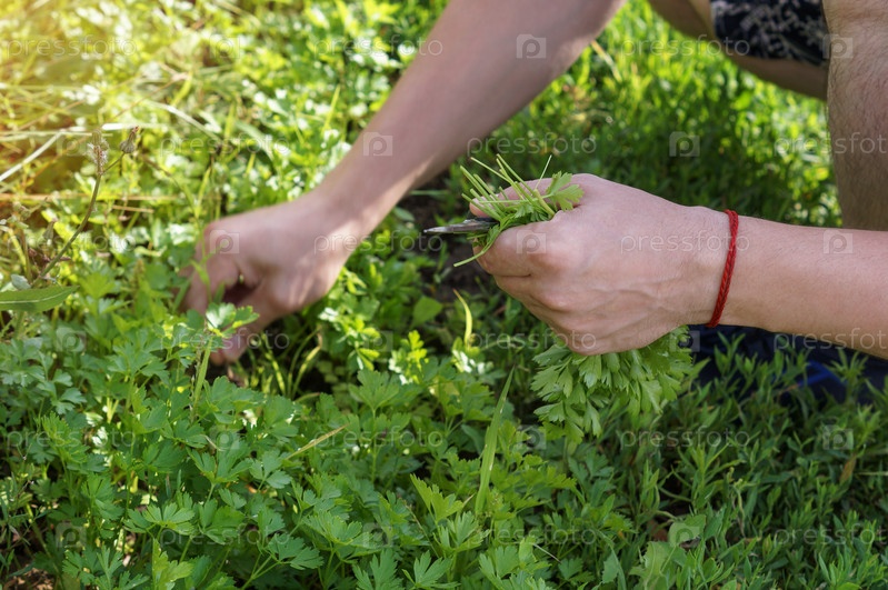 Мужчина срезает ножницами с грядки спелую сочную зеленую петрушку, спрятавшуюся в тенечке от жаркого летнего солнышка