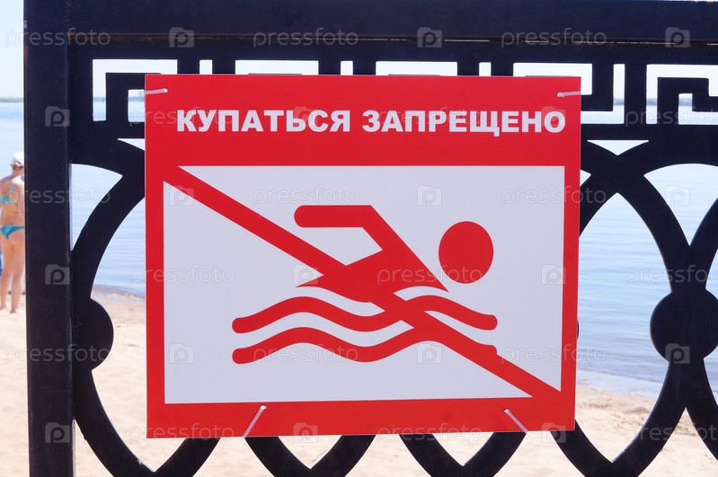 Красный знак "Купаться запрещено" на фоне песка и воды