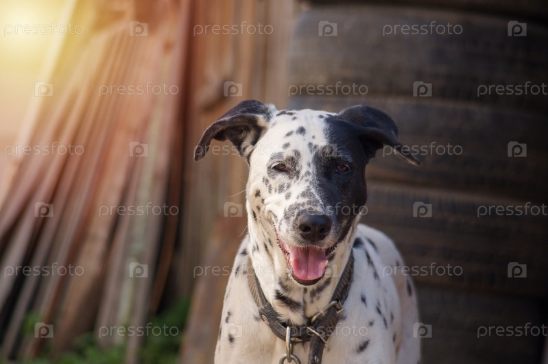 Сторожевая собака с необычным наполовину белым и наполовину черным окрасом мордочки улыбается в камеру