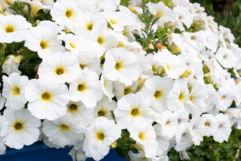 Белые цветы петунии цветут в саду, цветочный фон петунии