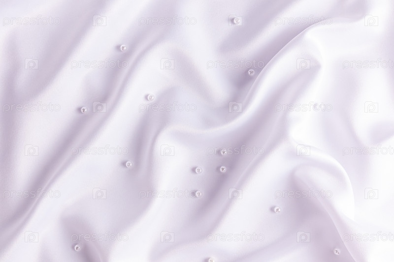Нежный свадебный фон из белого атласа с мягкими складками волн, белым жемчугом. макет дизайна, декора, открытки, альбома, обложки