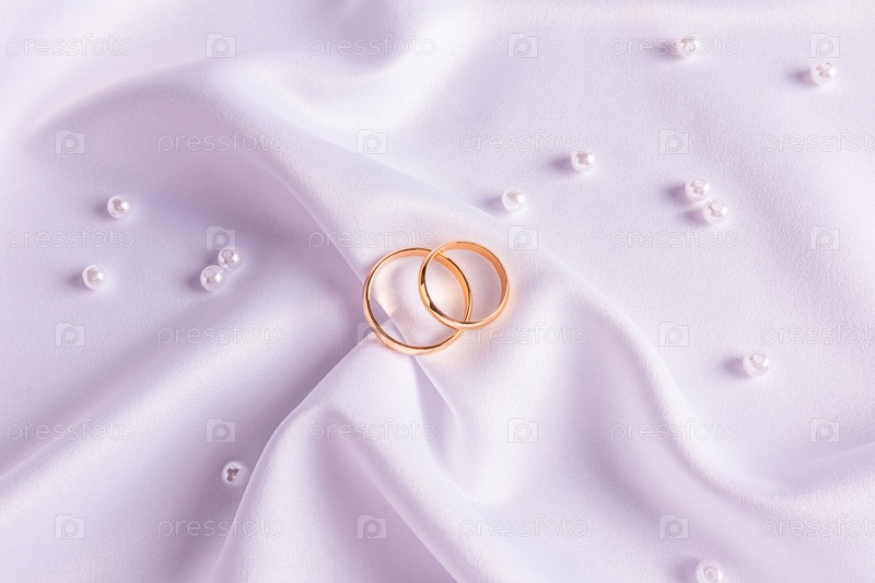 Шикарный свадебный фон с обручальными золотыми кольцами, лежащими на волне белой атласной ткани и жемчуга. Концепция свадьбы. открытка. приглашение