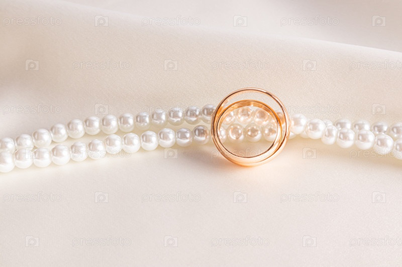 Два элегантных золотых обручальных кольца на фоне жемчужных бус и бежевого атласа. стильный свадебный фон. открытка. приглашение. передний план