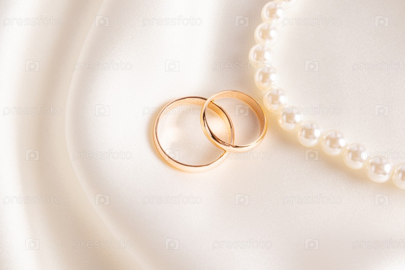 Красивая свадебная композиция с парой обручальных золотых колец на бежевом атласном фоне и бусинами из жемчуга. Макет приглашений, открыток
