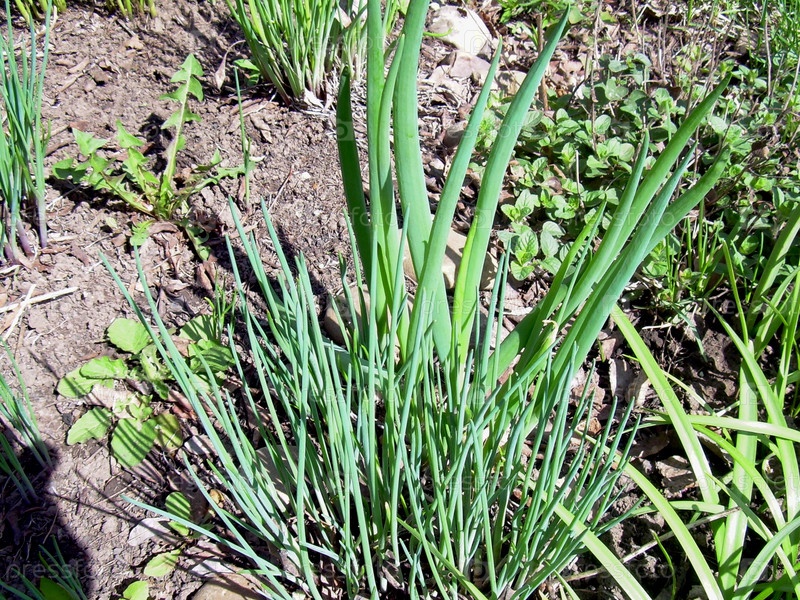 Первая весення зелень на грядке. зеленый лук разных сортов