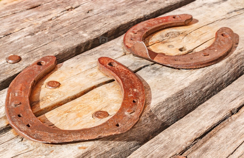 Две старые винтажные и ржавые подковы прибиты старинными гвоздями к высушенному и потрескавшемуся куску дерева