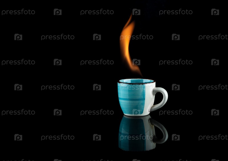 Кофейная чашка с языком пламени на черном зеркальном фоне