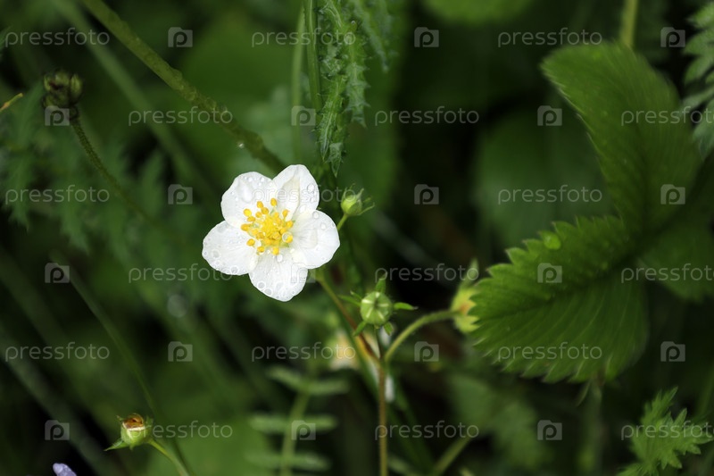Белый цветок земляники с каплями дождя на фоне лесной луговой травы