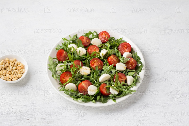 Тарелка со свежими листьями рукколы, нарезанными помидорами черри и мини-моцареллой, посыпанной салатной заправкой, и миской кедровых орешков на светло-сером фоне. Готовим вкусный вегетарианский салат
