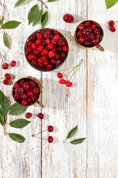 Летняя свежая вишня на деревянном фоне с листьями, баннер для магазинов, деревенский урожай, концепция здорового натурального питания, завтрак с ингредиентами, визитная карточка кафе,