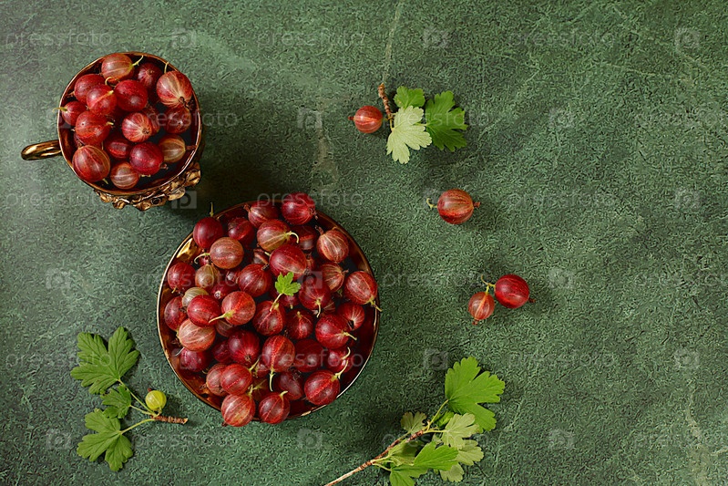 Летний свежий крыжовник на мраморно-зеленом фоне с листьями, баннер для магазинов, деревенский урожай, концепция здорового натурального питания, завтрак с ингредиентами, визитная карточка кафе