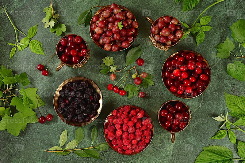 Летние свежие ягоды вишни, малины, ежевики и крыжовника на мраморно-зеленом фоне с листьями, баннер для магазинов, деревенский урожай, концепция здорового натурального питания, завтрак с ингредиентами,