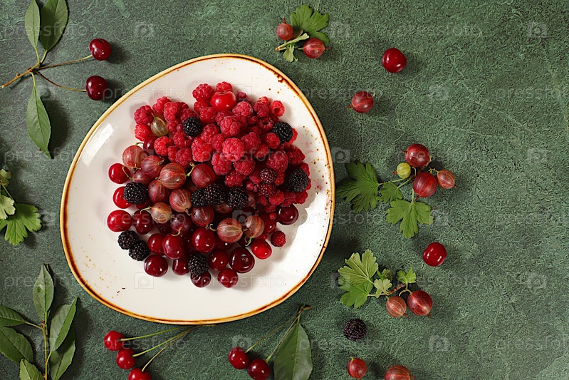 Летние свежие ягоды вишни, малины, ежевики и крыжовника на мраморно-зеленом фоне с листьями, баннер для магазинов, деревенский урожай, концепция здорового натурального питания, завтрак с ингредиентами,