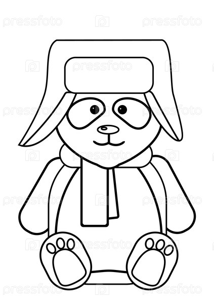 Забавная панда сидит в шапке-ушанке и шарфе. Векторная иллюстрация контура каракулей