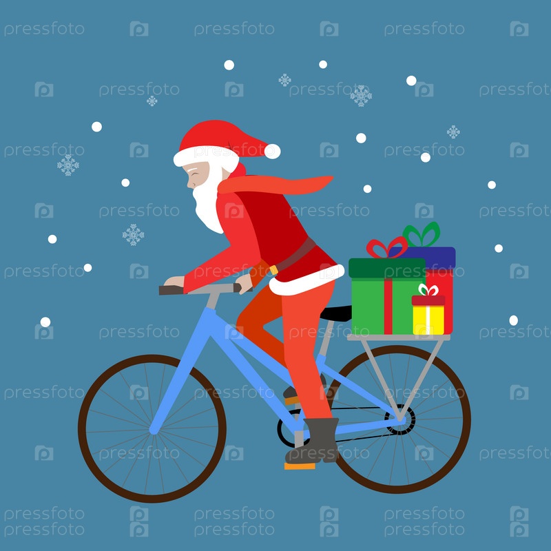 Милая рождественская открытка с молодым Сантой, едущим на велосипеде