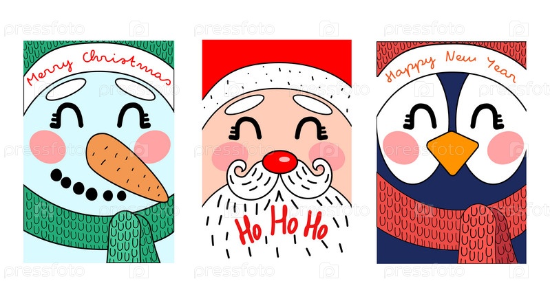 Три милые открытки со снеговиком, Сантой и пингвином