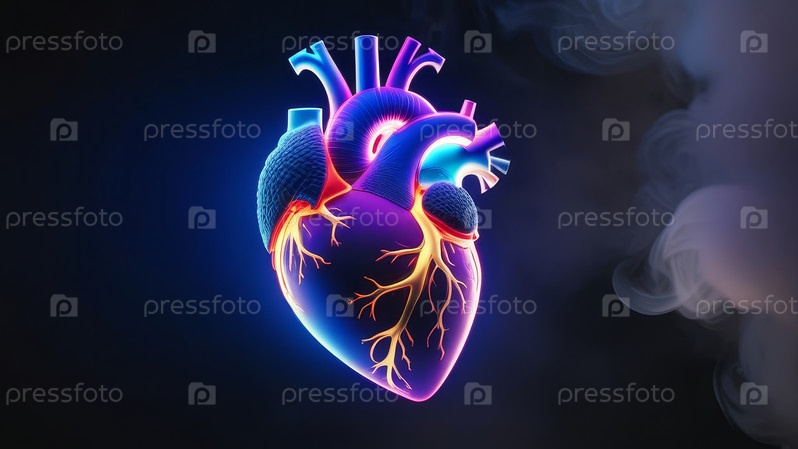 Яркая цифровая иллюстрация человеческого сердца на темном фоне